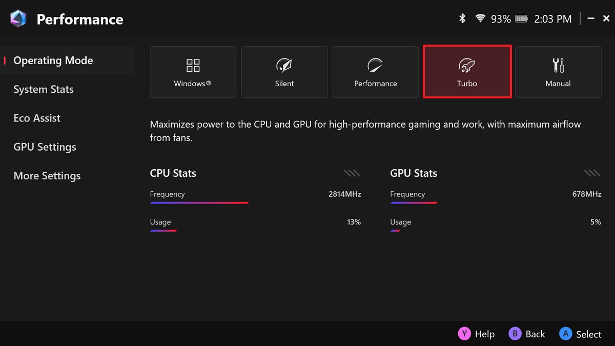 Вы можете переключиться в режим Turbo на вашем Xbox Ally через программное обеспечение Armoury Crate. Откройте Armoury Crate, затем перейдите в Настройки (значок шестерёнки), выберите Производительность, а затем выберите Режим работы. Оттуда выберите ‘Turbo’.