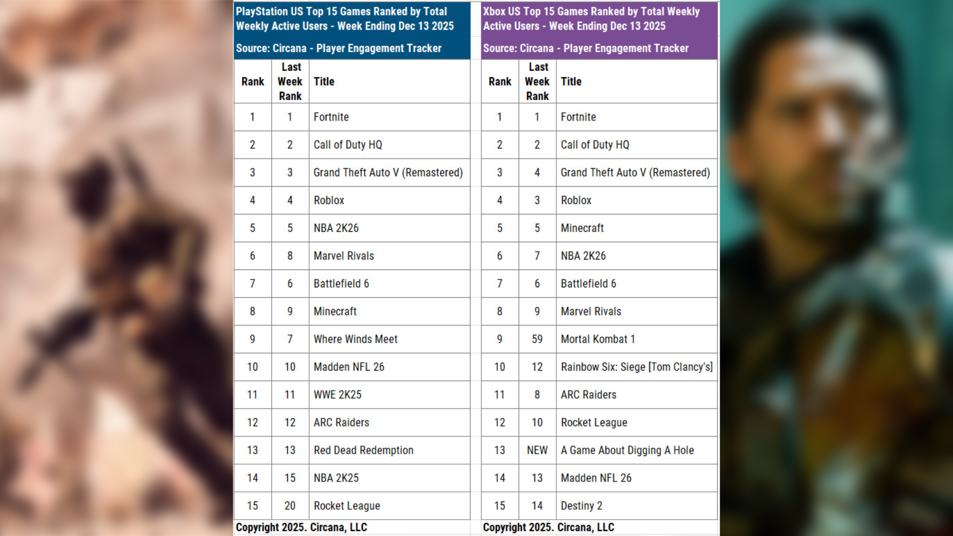 Согласно данным отслеживания вовлеченности игроков Circana, по состоянию на неделю, заканчивающуюся 13 декабря 2025 года, топ-15 игр по общему количеству еженедельных активных игроков выглядит следующим образом: Mortal Kombat 1 вернулась в топ-15 на Xbox благодаря своей доступности в Game Pass. Path of Exile 2 получила импульс в Steam в США и Канаде благодаря выходу контента ‘The Last of the Druids’ и бесплатного выходного мероприятия.